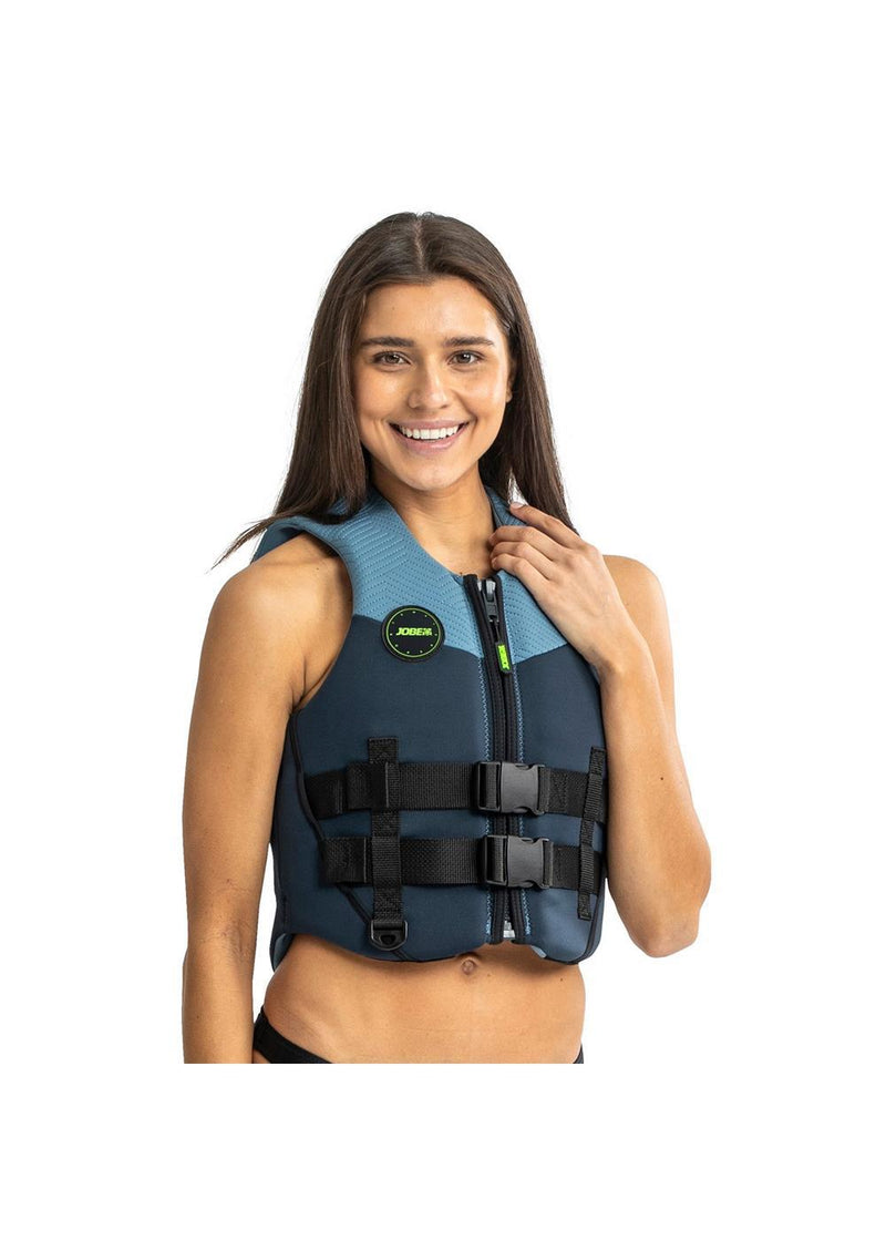 Experience ultimate comfort and safety with the Jobe Neoprene Womens Life Jacket. Made from the softest 30% limestone-based neoprene, this 50N ISO-certified vest features soft PVC foam, a YKK front zipper, strong buckles, and adjustable webbing straps for a perfect fit. The short fit allows for more freedom of movement, making it ideal for floating and swimming in open water. Plus, it includes a safety D-ring for attaching an emergency cord and is available in plus sizes.